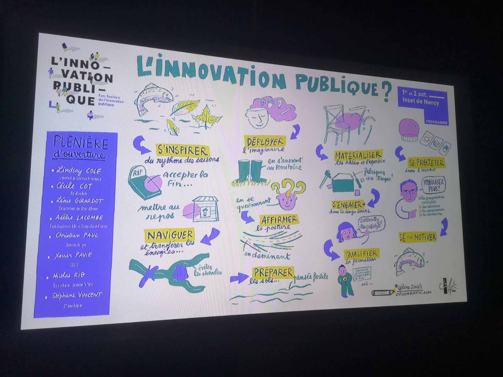 Que retenir, en quelques mots ? On ressort toujours de ce genre de retrouvailles avec un kaléidoscope de sensations… Dans un climat général devenu menaçant, on sent que l’heure n’est pas à la fête ni à une innovation publique triomphante, mais plutôt à une école du réel, du doute, du sensible, de la production de sens, d’une culture d’enquête, de la réflexivité individuelle et collective, mais aussi un ré-arrimage aux valeurs et à la défense du service public et de la démocratie, à la soutenabilité, à la saisonnalité de l’innovation, et même à la reconnection avec le vivant -inspirée par l’intervention lumineuse de Lindsay Cole avec qui nous travaillons à « repousser les frontières de l’innovation publique ».