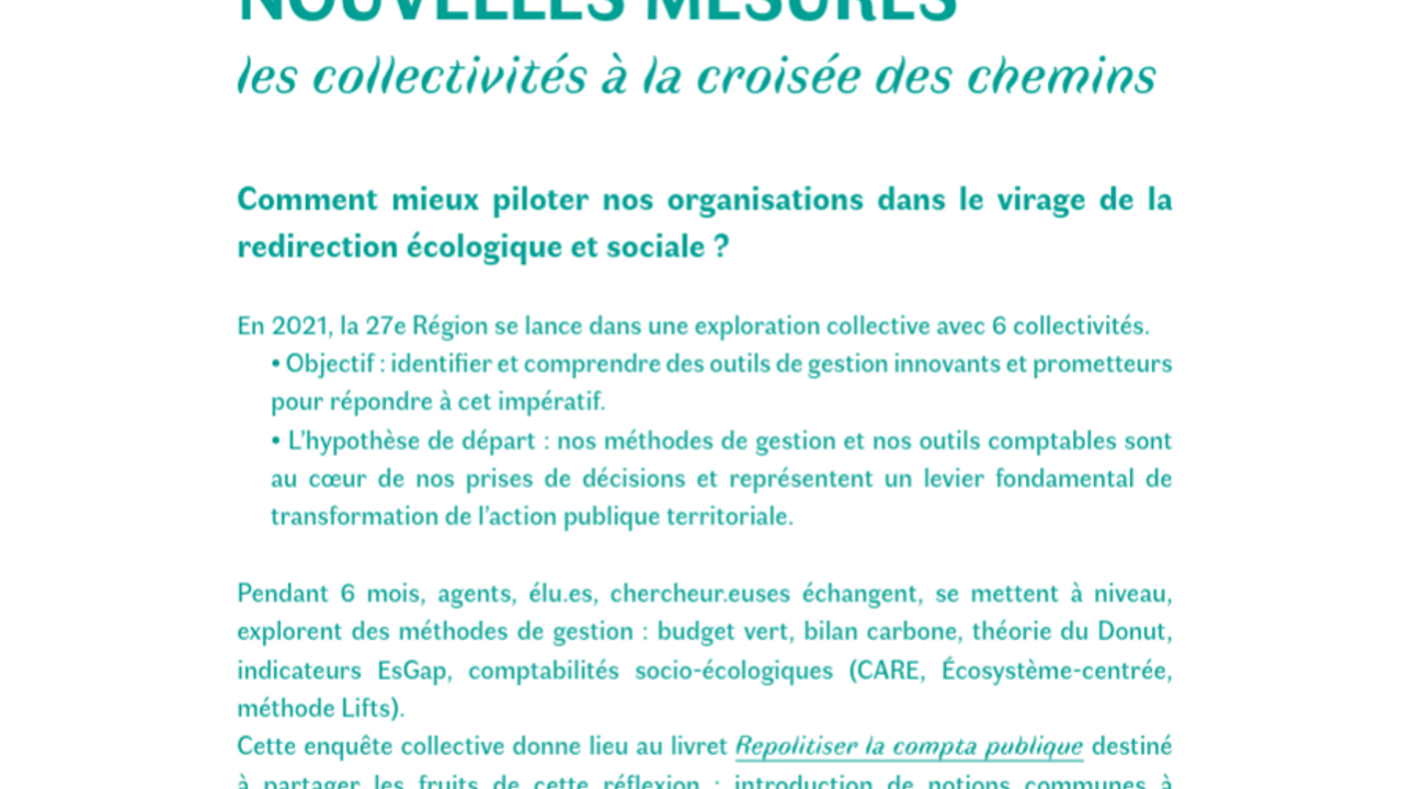 Nouvelles Mesures est un programme expérimental inter-collectivités visant à décrypter et expérimenter de nouveaux modèles comptables pour soutenir les acteurs publics face à leur responsabilité écologique et sociale, et leur permettre de développer des modes d'intervention compatibles avec les limites planétaires et le bien-être des personnes.
