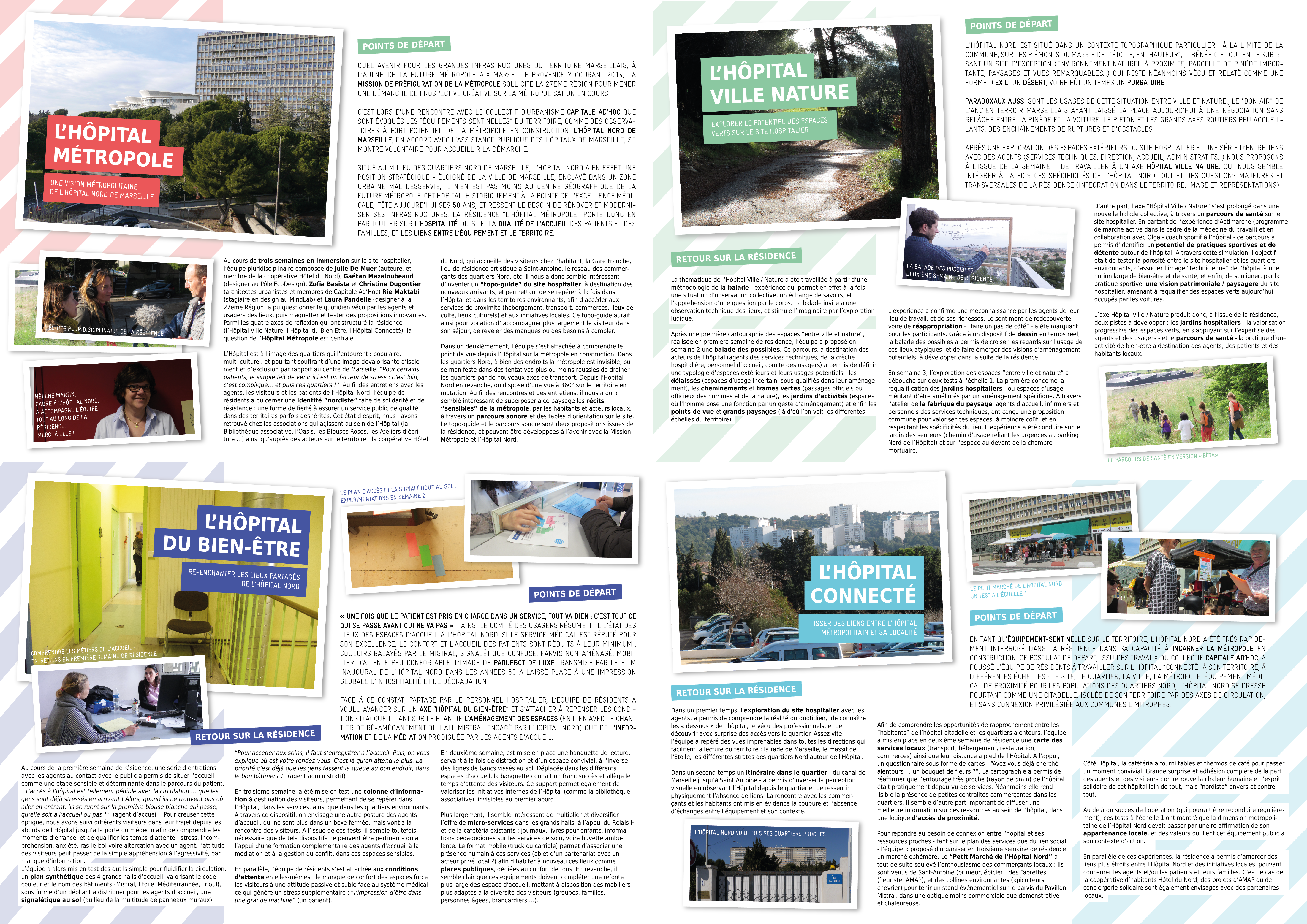 Situé au milieu des quartiers Nord de la ville, l'Hôpital Nord dispose d'un emplacement stratégique - éloigné du centre de Marseille, enclavé dans une zone urbaine mal desservie, il n'en est pas moins au centre géographique de la future métropole. Cet Hôpital, historiquement à la pointe de l'excellence médicale, fête aujourd'hui ses 50 ans, et ressent le besoin de moderniser ses infrastructures, notamment pour faire face à des situations de plus en plus complexes au niveau de l'accueil des patients et de l'accompagnement de leurs familles, dans des quartiers en pleine transformation. La résidence « L'Hôpital Métropole » porte donc en particulier sur l'hospitalité du site, et les liens profonds entre cet équipement et son territoire - limitrophe, urbain, patrimonial ... et métropolitain.