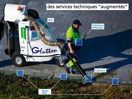 Le travail des agents techniques de la mairie a considérablement changé. Ils concentrent maintenant leurs déplacements sur des interventions ou des réparations lourdes. Une partie importante de leur travail consiste à surveiller un parc d’équipements en réseau à distance. Car le territoire de la commune est dorénavant couvert de capteurs de toutes sortes : des puces RFID (radio fréquence) sont dans les murs des bâtiments publics, dans les trottoirs et tout le mobilier et les réseaux urbains (éclairage public, réseau d’eau et de gaz, etc), des nano-webcams sont placés dans les rues et des capteurs comptabilisent les passages sur les routes, des détecteurs de pollution quadrillent la commune, des dispositifs de surveillance sont placés au bord des berges pour surveiller les risques d’innondations, etc. Les véhicules municipaux et tous les équipements mobiles (bennes à ordure et poubelles municipales) sont depuis longtemps équipés d’un système de géolocalisation qui les tracent en temps réel. Les agents techniques sont eux-mêmes équipés de technologies mobiles, qui leur permet d’agir en flottes, de se repérer les uns les autres sur le territoire, d’optimiser leurs déplacements.