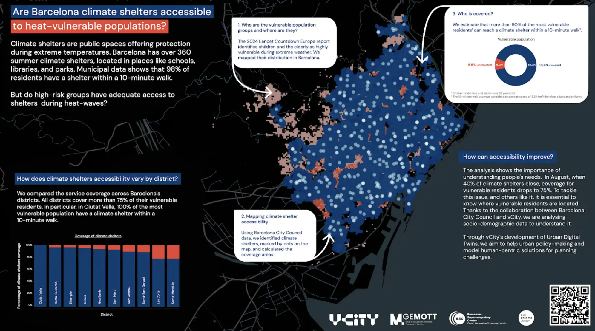 Ces espaces n’offrent pas nécessairement d’aménagement ou de service additionnel tels que des horaires d’ouverture élargis, des activités spécifiques, etc. Leur carte, largement diffusée dans la ville, offre une lecture de la ville au prisme de la canicule : comme le rappelle Mar Sartorras, elle est nécessaire car « les habitants n’ont pas toujours l’impression de pouvoir venir dans ces lieux simplement pour se sentir à l’aise et se mettre au frais ».