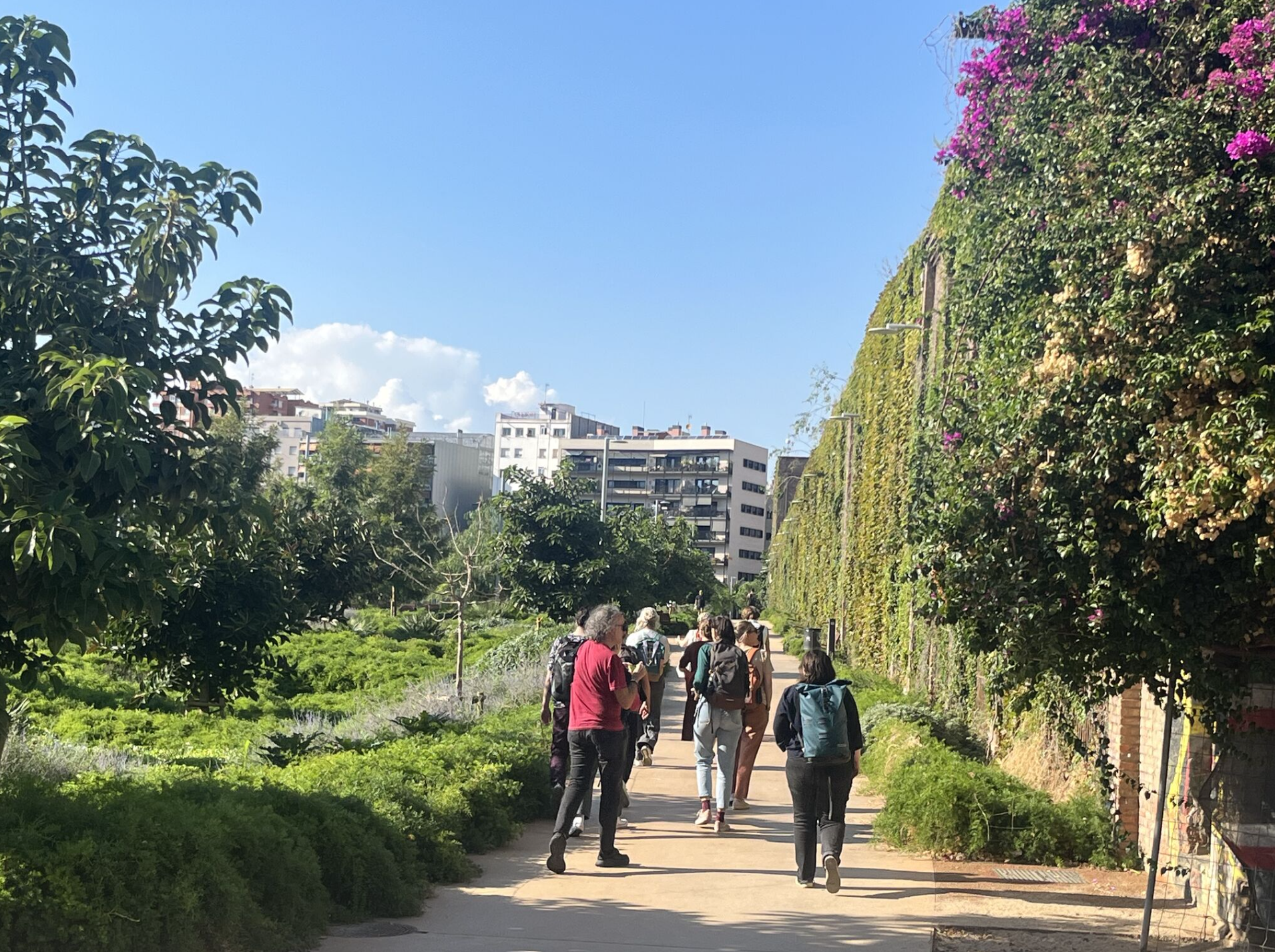 Trois intenses journées pour les aborder, avec pour démarrer plusieurs visites de terrain dans les villes de Cornellà de Llobregat, Cerdanyola del Vallès et Barcelone, à la découverte de quelques exemples de refuges climatiques mis en place par ces collectivités. Au-delà de cette dynamique institutionnelle, nous nous sommes aussi intéressés aux projets de refuges portés depuis la société civile, au travers de la recherche action du collectif Aqui.