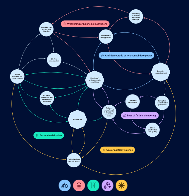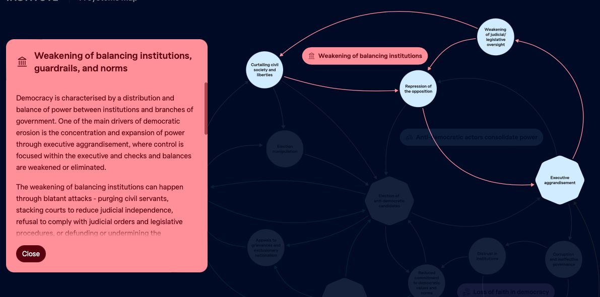 - Des leviers de changement et des démarches de prévention peuvent être activées : La cartographie des systèmes permet de mieux cerner les possibilités d’intervention et de comprendre comment un ensemble de mesures prises pour contrer un aspect de l’érosion démocratique est lié à l’ensemble.